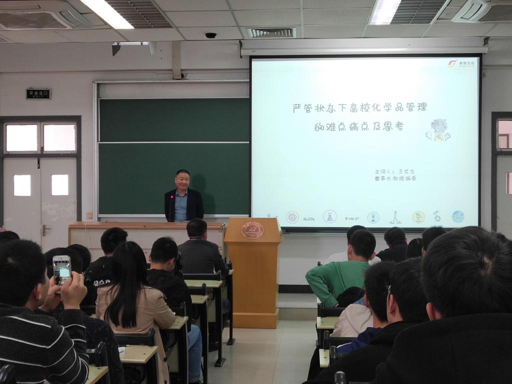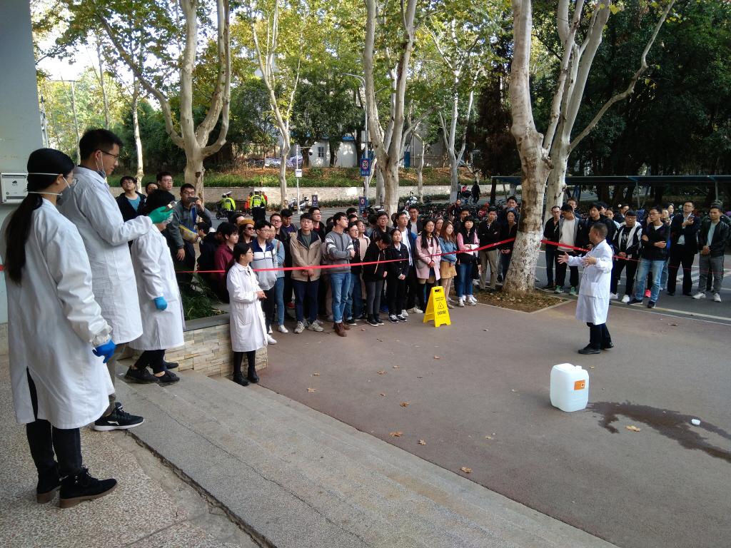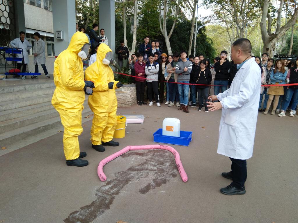 作为2019年安全文化周的重要活动之一,11月14日我院组织开展了危险化学品安全知识讲座及废弃物泄漏应急处置演练。本次活动参与的院系遍布全校,除化学院以外,还有材料学院、能源学院、光电学院、电气学院、机械学院、物理学院、生命科学院、国光中心等涉及危险化学品使用的单位的教师和学生代表约200人参加了本次培训。化学与化工学院副院长朱启军、实验室与设备管理处安全科科长朱菁萍以及安全科相关老师出席了培训会和应急演练。