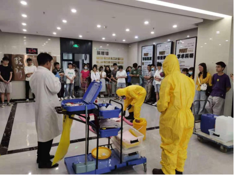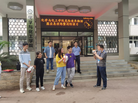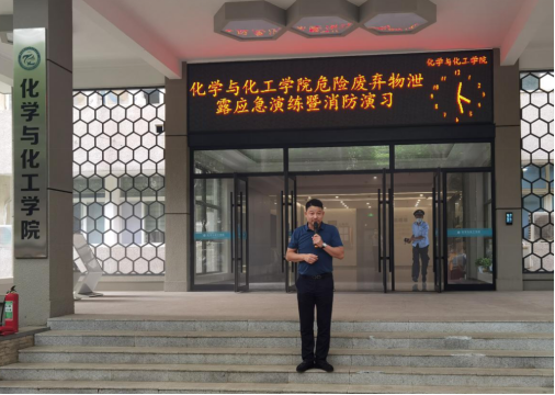为进一步强化全院师生的安全意识,提高师生应急救灾的实战技能,防患于未然。2021年6月24日下午14:30我院联合校保卫处、赛弗安全文化等部门在化学楼组织开展了“化学废弃物泄漏应急演练暨消防演习”活动,化学楼和韵苑28栋的一百多名师生参加了本次演练活动。保卫处治安与消防管理科科长毛天音、副科长郑明皞、化学与化工学院副院长朱启军、以及赛弗丁睿总经理参与指导本次活动。