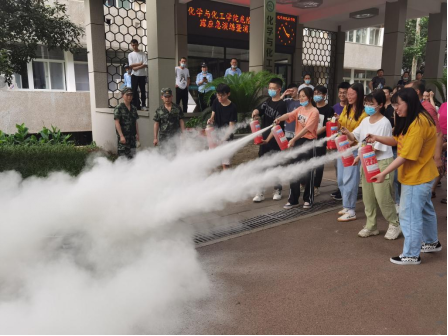 消防疏散演练和灭火实操阶段,校保卫处消防工作人员首先为参演师生演示了干粉灭火器、消防水带等灭火器具的使用规范。接着参演师生轮番利用灭火器具对油桶中的明火实施了扑灭。随后,郑明皞老师重点给大家演示了防毒面具的使用方法,部分同学亲身体验了戴上防毒面具后呼吸环境的变化,掌握了火灾险情出现时的逃生技能。