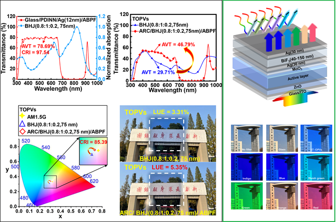 能源与环境问题是制约世界经济和社会可持续发展的两个突出问题。有机光伏(OPV)技术是一种具有代表性的新兴绿色能源技术,它集丰富的光敏层活性材料、便捷的设计合成和环境友好于一体。相对于硅基、钙钛矿基等太阳能电池,具有更离散吸收的有机半导体材料可以被有意设计为将光吸收集中在紫外线和近红外区域,并在可见光范围内表现出弱吸收,因此OPV是最适合半透明器件(TOPV)的光伏技术。TOPV可以作为一种辅助能源,与窗户、天窗、汽车、温室和大型公共空间集成,为进入光伏领域的市场提供了极其宝贵的切入点。本次报告基于薄银金属的光学集成设计与制备,分别实现了高光子利用率和高纯度色彩的有机光伏器件。