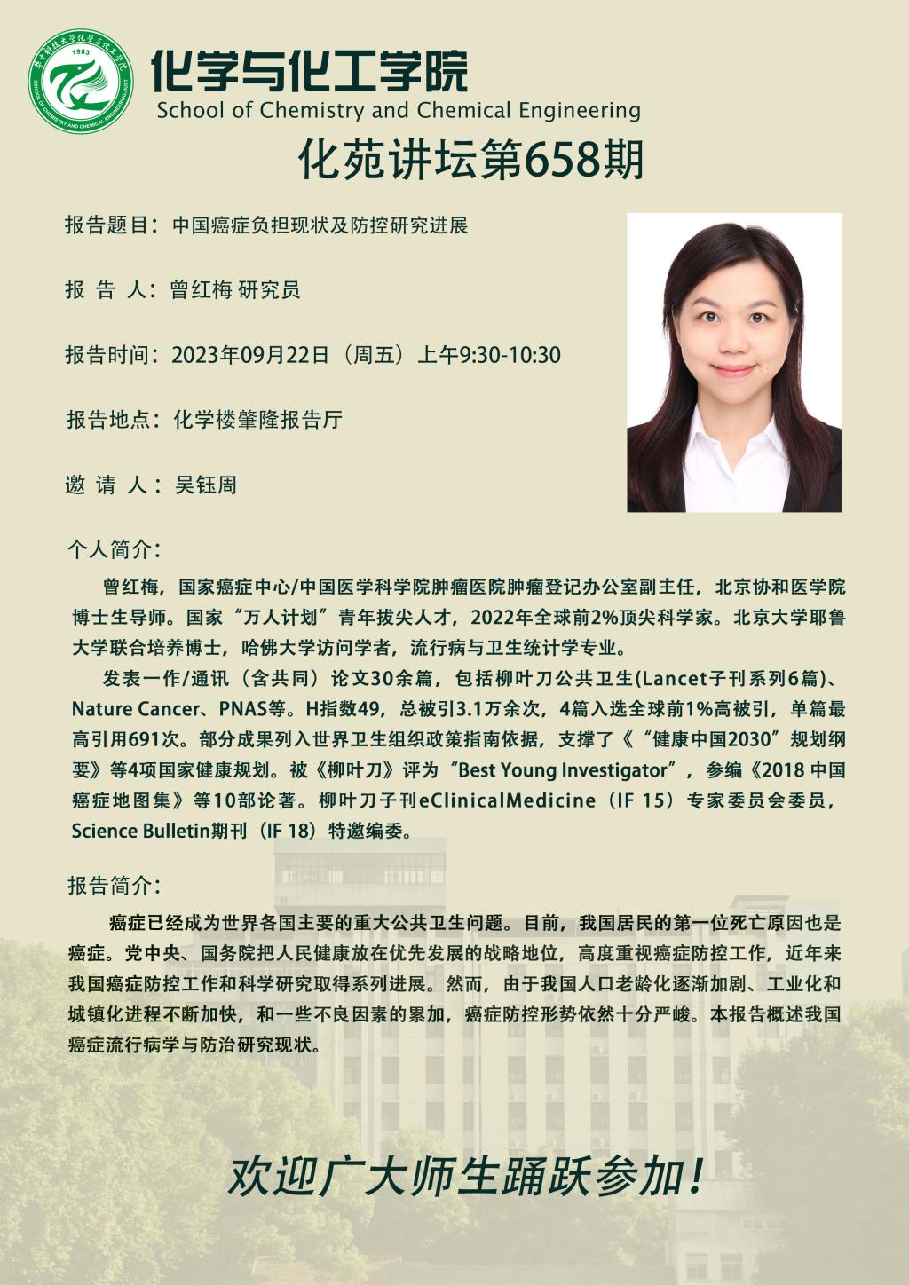 国家癌症中心/中国医学科学院肿瘤医院曾红梅研究员做客第658期化苑讲坛