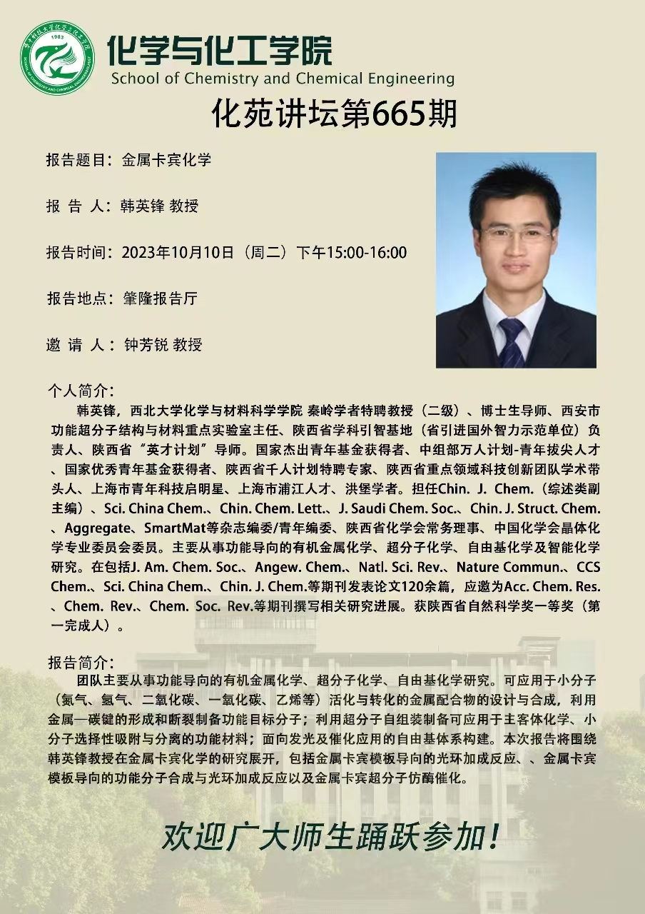 西北大学韩英锋教授做客第665期化苑讲坛