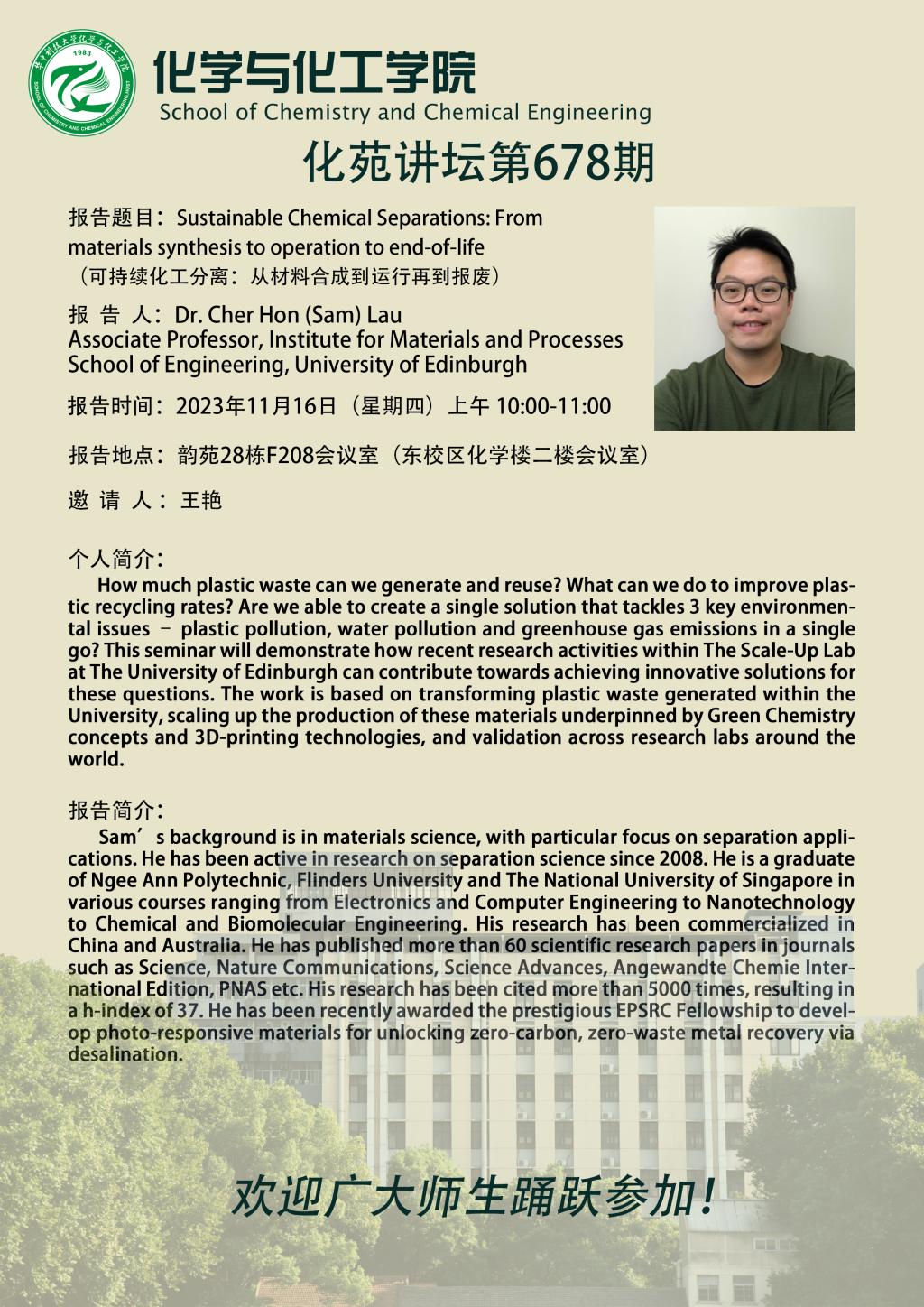 Edinburgh大学Cher Hon(Sam)Lau副教授做客第678期化苑讲坛