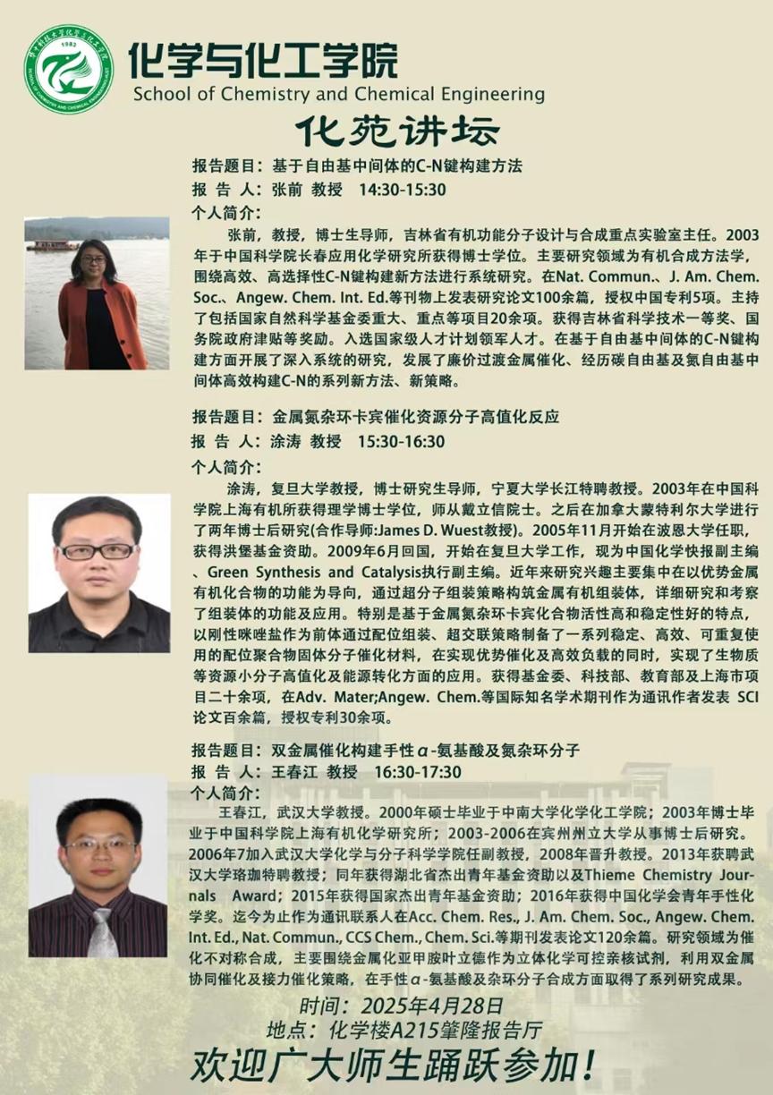 东北师范大学张前教授、复旦大学涂涛教授、武汉大学王春江教授做客第760期化苑讲坛