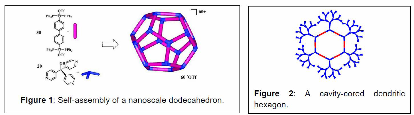 The use of just two types of building blocks, linear and angular, in conjunction with symmetry considerations allows the rational design of a wide range of metallocyclic polygons and polyhedra via the coordination motif. We have used this approach to self-assemble a variety of 2D supramolecular polygons such as triangles, rectangles, squares, hexagons, etc. as well as a number of 3D supramolecular polyhedra: truncated tetrahedra, triginal prisms, cubooctahedra4 and dodecahedra. An example of the methodology is illustrated in Figure 1. More recently we have functionalized these rigid supramolecular scaffolds with different electroactive, host-guest, dendritic (Figure 2), and hydrophobic/hydrophilic moieties and have investigated the properties of these multifunctionalized supramolecular species. Additionally, we have begun to explore the self-assembly of 2D polygons and 3D polyhedra on a variety of surfaces with the aim of developing their potential to be used in device settings. These novel, supramolecular ensembles are characterized by physical and spectral means. The design strategy, formation, characterization and potential uses of these novel metallocyclic assemblies will be discussed, along with our very recent results.