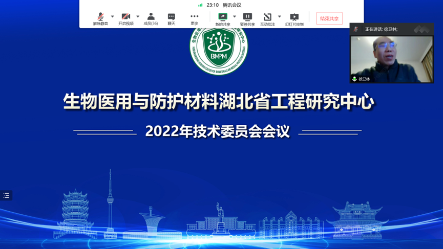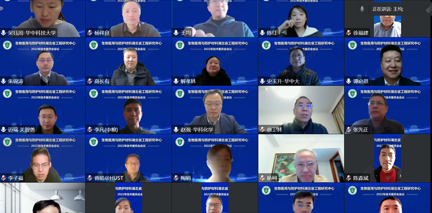 2022年12月18日上午,生物医用与防护材料湖北省工程研究中心2022年度技术委员会会议在我校举行。工程中心技术委员会主任徐卫林院士(武汉纺织大学),技术委员会副主任张先正(武汉大学)、丁超(金发医疗),委员陈红(苏州大学)、高长有(浙江大学)、关智勇(迈瑞科技)、李凡(中粮生物科技)、李志高(协卓医疗用品)、史玉升(华中科技大学)、陶娟(武汉协和医院)、王均(华南理工大学)、徐福建(北京化工大学)、杨柯(中科院金属所)、杨祥良(华中科技大学)、詹智勇(现代精工)、张必翔(武汉同济医院)、郑玉峰(北京大学)(按拼音首字母顺序)等,华中科技大学副校长解孝林、化学与化工学院主要领导、工程中心骨干成员等线上参加了本次会议。会议由技术委员会主任徐卫林院士主持。