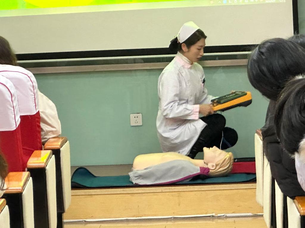 随后,校医院护士杜文丽向同学们讲解了基础的生命紧急事故急救方法,如心脏骤停、窒息、触电等,并通过人体模型向在座师生展示了心肺复苏、除颤仪和海姆立克急救法的具体操作。