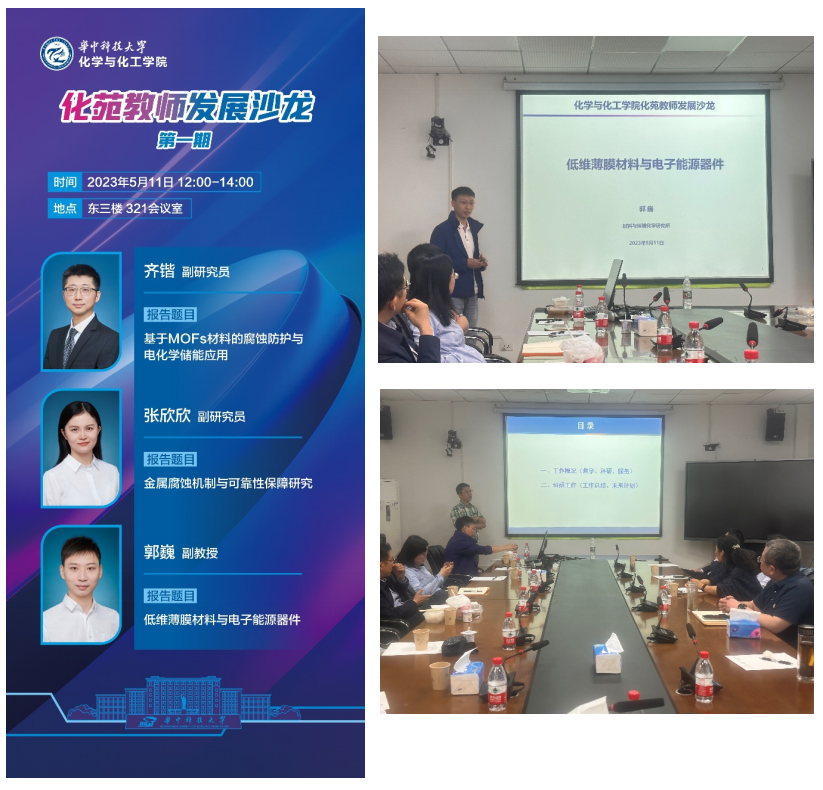 2023年5月11日,化苑青年教师发展沙龙第一期成功举办。青年教师郭巍副教授、齐凯副研究员进行工作汇报,学院党委书记江洪洋,院长谭必恩,副院长龚跃法、顾彦龙和部分教师参会,沙龙由院工会主席高中洪主持。