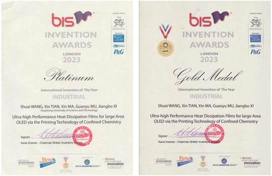 近日,英国伦敦国际发明展(British Invention Show , BIS)组织公布了2023年度获奖名单,华中科技大学王帅教授团队的“限域化学印刷技术实现大面积OLED超高性能散热薄膜”(Ultra-high Performance Heat Dissipation Film for Large Area OLED via the Printing Technology of Confined Chemistry)荣获第22届英国伦敦国际发明展铂金奖和金奖。