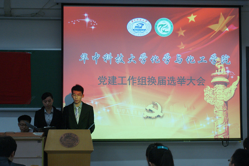 2013年6月17日七点,化学与化工学院党建工作组第一次换届大会在西十二教学楼隆重召开。出席本次大会的嘉宾和代表有:化学与化工学院党总支副书记吴疆鄂,学工组长石渊龙,党建辅导员付冰冰,分团委书记朱玉玲以及各兄弟院系党建工作组负责人等。化学与化工学院本、硕支部学生党员代表、各级学生组织代表以及党建工作组全体成员出席了本次大会。