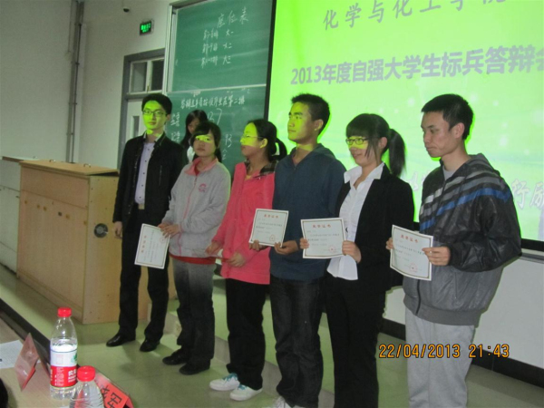 最后,经过现场投票,聂晓琦、石培、丁言言、祁晗璐和彭玲五位同学获得“化学与化工学院自强大学生标兵”称号。院学工组长石渊龙老师为他们颁发了荣誉证书。