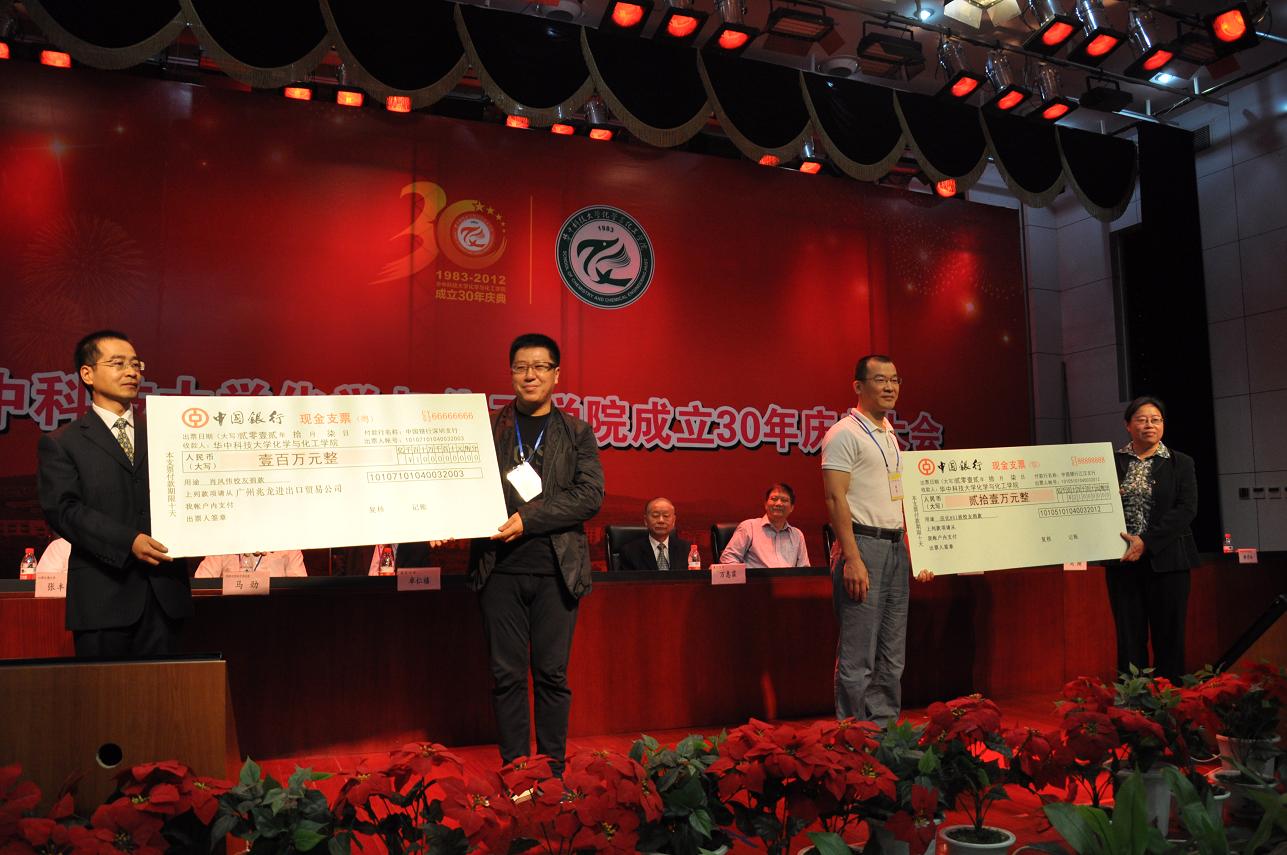 院长解孝林教授致辞,回顾了学院的发展历程,介绍了学院最近发展情况和学院十二五规划。嘉宾代表马劲处长、刘良炎研究员,校友代表国家纳米科学中心陈春英研究员、教师代表朱锦涛教授和学生代表黄嘉宇同学分别为学院送上了深深的祝福。副院长聂进教授宣读了对创建化学系潜心育人的23名退休老教师和老领导授予“建系突出贡献奖”荣誉称号的表彰决定,罗俊为朱慧楠教授、徐辉碧教授、郑家燊教授3名代表授牌。随后,大会举行了捐赠仪式。