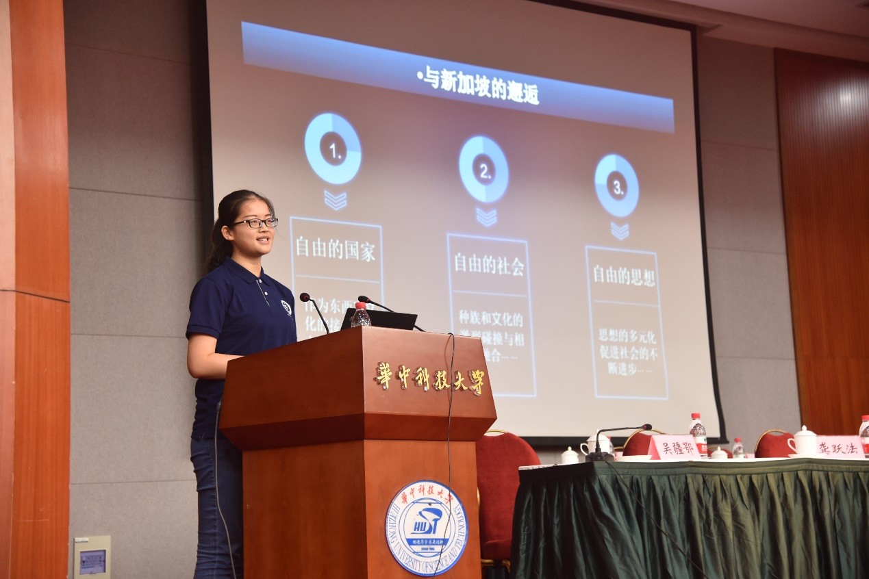 会议第二阶段是由今年暑期到国内外交流的三个团队汇报暑期交流情况,首先是赴新加坡交流汇报的学生代表柳学睿同学,她向我们展示了新加坡整洁的环境、高素质的公民以及两所顶尖大学—新加坡国立大学和南洋理工大学的教学设施、教学风格与教学理念,给同学们留下了对走出国门、与世界接轨的憧憬。