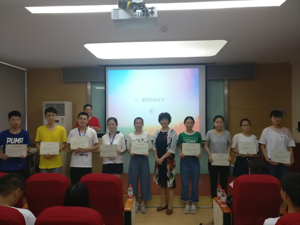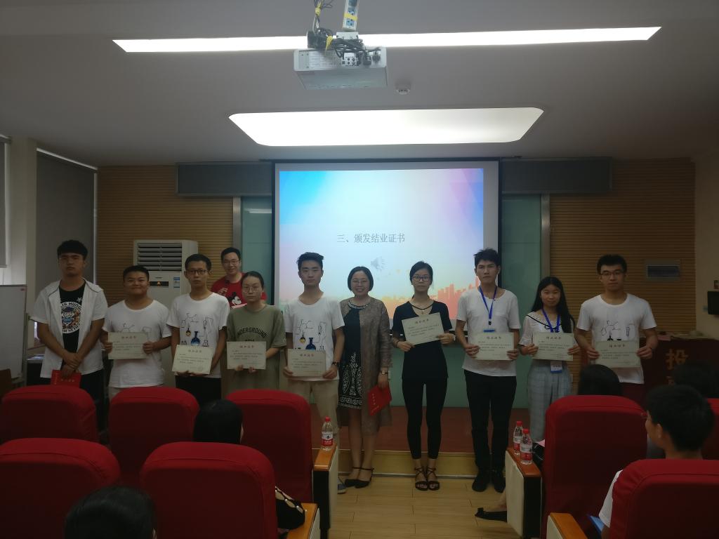 接下来,刘炼老师、刘宏芳副院长、朱丽华教授以及唐翔鹰教授分别向优秀营员颁发了结业证书并合影留念。最后,夏令营全体成员以及老师、志愿者们在一号会议室合影,至此,华中科技大学化学与化工学院学术夏令营圆满结束。化学与化工学院副院长刘宏芳教授,分析化学研究所所长朱丽华教授,有机与精细化工研究所所长唐翔鹰教授以及教务科科长刘炼老师参加了此次闭营仪式。