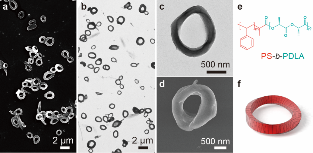 研究团队通过手性嵌段共聚物聚苯乙烯-block-聚右旋乳酸(PS-b-PDLA)在THF/water混合溶剂中快速组装制备了一种微米尺度的环状组装体。分析发现,约50%的环状组装体的环壁具有180°扭曲结构,且这种扭曲结构主要呈左手性扭曲。我们将这种含扭曲结构的环状组装体称为嵌段共聚物莫比乌斯环。通过对环状组装体形成的动力学机制进行分析,发现环状组装体是由嵌段共聚物自组装形成的小尺寸球形胶束融合形成复合球形胶束,复合球形胶束发生形变形成条带状组装体,条带状组装体闭合成环形成的。结合透射电子显微镜、广角X射线衍射、圆二色谱,及傅里叶转变红外光谱等一系列表征手段证实,状组装体的形成是疏水相互作用、结晶和手性作用共同作用的结果。