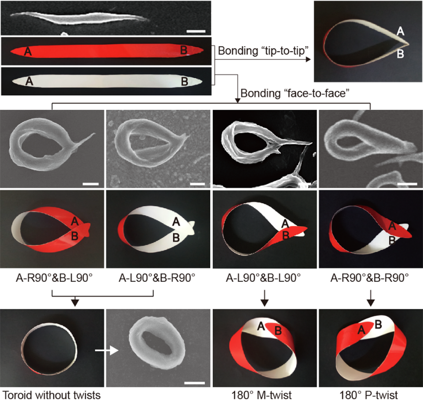 研究发现,嵌段共聚物莫比乌斯环环壁上扭曲结构的产生于条带闭合成环过程:条带两端发生顺时针或逆时针90°旋转以后以“面-面”贴合的形式发生有效粘合,两端同时顺时针旋转90°则得到左手性扭曲的莫比乌斯环,而同时逆时针旋转90°则得到右手性扭曲的莫比乌斯环。