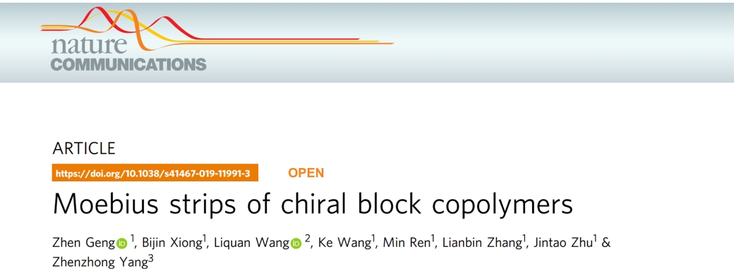 9月9日,《自然通讯》(Nature Communications)杂志在线刊发了华中科技大学朱锦涛教授、清华大学杨振忠教授研究团队题为“Moebius strips of Chiral Block Copolymers”的最新研究成果。