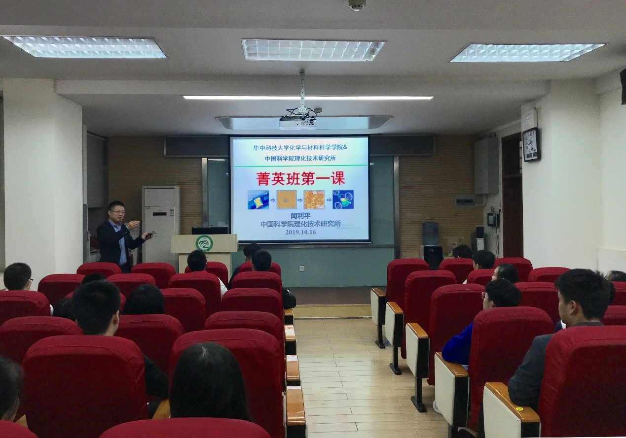(通讯员:刘赵昊旻)10月16日晚8:00,在2019级化学菁英班面试选拔结束后,中国科学院理化技术研究所研究员、杰出青年基金获得者、2018级化学菁英班班主任张铁锐,理化所研究员、杰出青年基金获得者、2019级菁英班班主任闻利平做客我院开展主题讲座暨思政课教育。化学与化工学院党委书记李涛、党委副书记吴疆鄂、副院长龚跃法与2017、2018、2019级化学菁英班的同学们共同聆听了报告。闻利平研究员为化学菁英班的同学们讲授“菁英班第一课”,在新的学年引导同学们拓宽学习视域,激发科研动力。张铁锐研究员为大家上主题为“为中华之崛起而读书”的思政课,勉励大家尽早树立远大目标,走好科研报国的每一步。