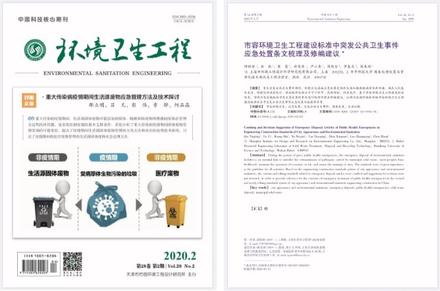 疫情爆发后,我院陈朱琦教授基于武汉市和湖北省涉疫生活垃圾环境卫生设施应急处置的一手数据及大量实践经验,与住建部市容环境卫生标准化技术委员会秘书处合作,针对我国环境卫生工程建设标准普遍存在应急预案编制方法不明晰、应急处置针对性不突出、应急措施不具体等问题展开研究。2020年4月25日,陈朱琦教授作为唯一通讯作者,以华中科技大学和国家住建部市容环境卫生标准化技术委员会挂靠单位上海市环境工程设计科学研究院共同署名,在核心期刊《环境卫生工程》杂志“疫情防控技术与管理”专栏,发表题为《市容环境卫生工程建设标准中突发公共卫生事件应急处置条文梳理及修编建议》的文章,对我国环境卫生领域现行及在编标准涉及应急处置的条文进行了全面梳理,提出了这类标准中有关突发公共卫生事件应急处置的修编建议。