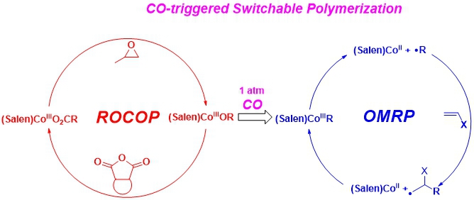 2月3日,《德国应用化学》杂志以“Hot Paper”形式在线刊发了解孝林教授团队和法国图卢兹大学Rinaldo Poli教授合作研究成果 “Switchable Polymerization Triggered by Fast and Quantitative Insertion of Carbon Monoxide into Cobalt‐Oxygen Bonds” (Doi.org/10.1002/anie.201914216),以常压一氧化碳和可见光作为双重开关,实现了聚合机理从ROCOP到OMRP的原位转化,利用酸酐、环氧化合物、丙烯酸酯的混合单体一步合成了生物降解聚酯-b-聚丙烯酸酯嵌段共聚物。与前期工作(Angew. Chem. Int. Ed. 2019, 58, 14311-14318)相比,一氧化碳调控聚合机理切换的实施条件更温和、合成效率更高。合成的嵌段共聚物同时具有生物降解聚酯和聚丙烯酸酯的优良性能,可有效调控生物降解聚合物性能;同时该嵌段共聚物也可作为生物降解聚酯共混物及其复合材料的相容剂,为实现生物降解聚合物的高性能化和低成本制造提供了有效途径。