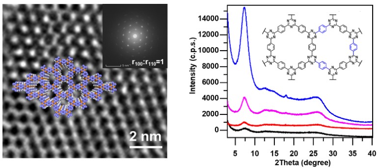 图2. 结晶性CTF的高分辨透射电镜图片与X射线衍射图