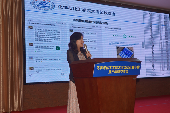大湾区校友会秘书长胡龙娇为校友们做年度工作汇报,她先回顾了近一年来校友会的发展历程,然后介绍了疫情期间校友们为学院捐款捐物的情况,并对明年的发展做出了规划。