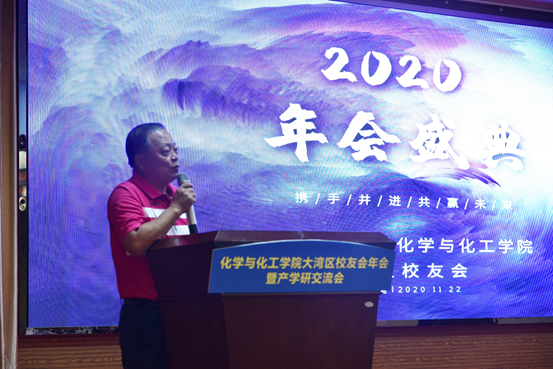 化学与化工学院大湾区校友会执行会长孙卓明先生为校友会年会致辞,他祝愿学校和东莞产学研合作越走越好,其次表明我们的时代已来临。作为华中大化院校友,应该把握机会,凝聚校友力量,搭建资源共享平台,携手传承帮扶助力后辈成长。
