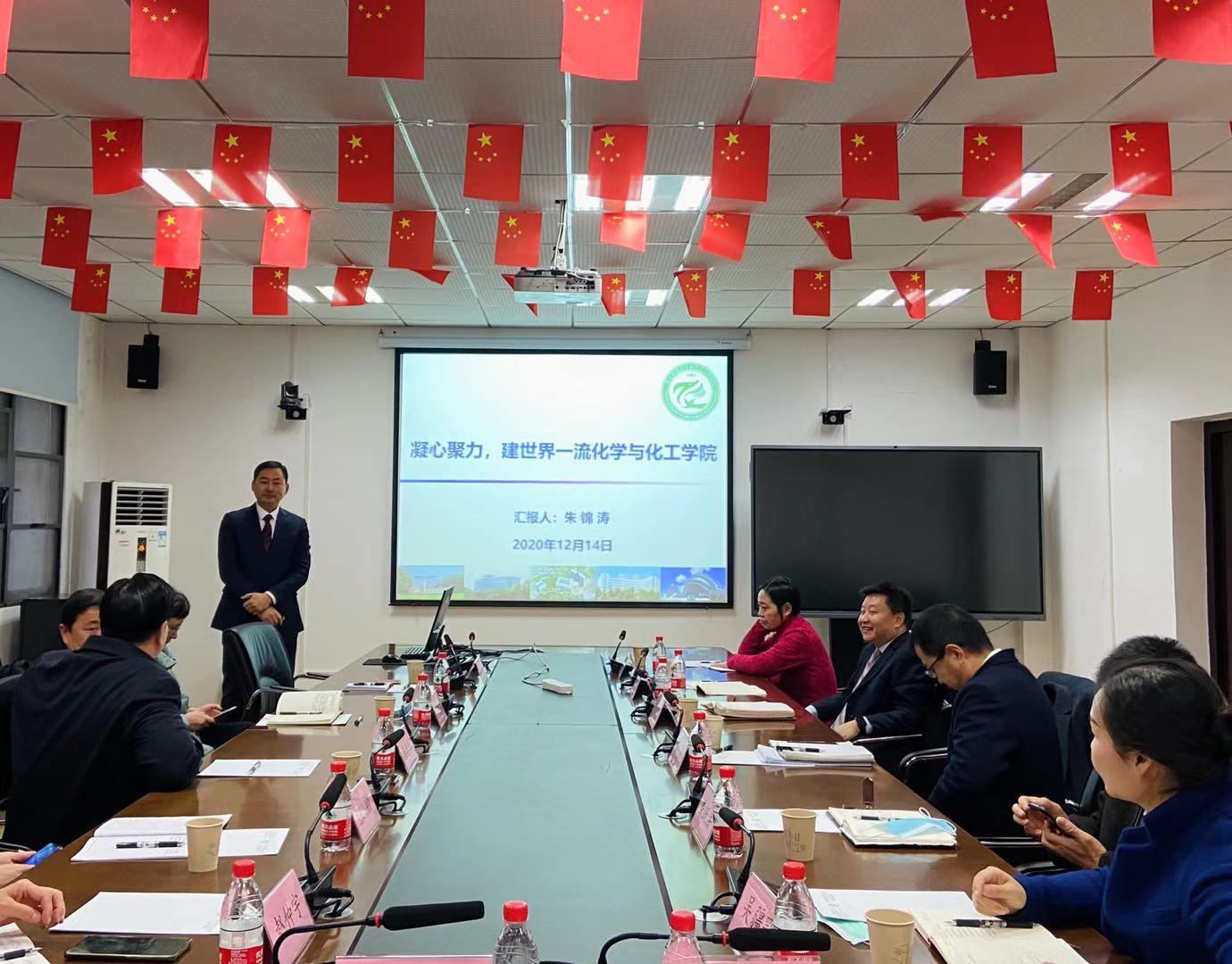 化学与化工学院院长朱锦涛教授以“凝心聚力,建世界一流化学与化工学院”为主题,围绕学院“十三五”工作回顾、“十四五”形势分析、“十四五”发展战略三个方面进行了汇报,分析了我院“十三五”期间在党旗领航、教学成果、人才培养、师资队伍建设、学科建设、科学研究、实验安全制度与设施、国际合作与交流等方面所取得的成绩、形成的经验。同时,朱院长指出当前学院仍存在着学科发展不平衡、师资力量不均衡、高端人才偏少、学科交叉有待向纵深发展等不足,并重点对我院“十四五”的发展目标、困难瓶颈和思路举措等进行了剖析。