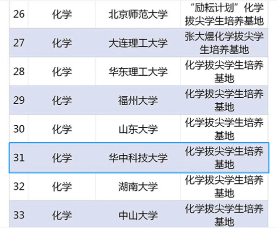 为深入贯彻落实习近平总书记关于“加强基础学科拔尖学生培养,在数理化生等学科建设一批基地,吸引最优秀的学生投身基础研究”的重要指示精神,教育部深入实施基础学科拔尖学生培养计划2.0,加快培养基础学科拔尖人才。在首批(2019年度)遴选建设104个基础学科拔尖学生培养基地的基础上,根据相关文件要求,在各地各高校申报、专家审议基础上,教育部按相关工作程序确定了基础学科拔尖学生培养计划2.0基地(2020年度)名单。其中华中科技大学化学拔尖学生培养基地入选。