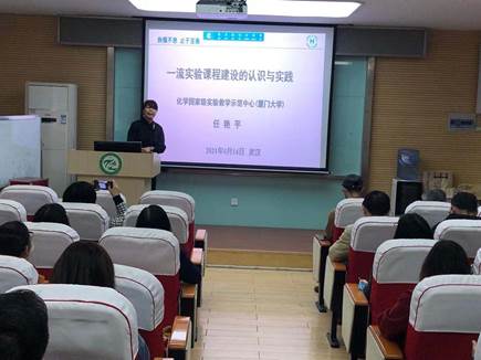 一流的教学内容是一流课程建设的核心。为拓展化学学院本科实验教学内容建设与改革的视野,化学与化工学院第484期化苑讲坛于4月14日上午在化学楼一号会议室顺利举行。本期讲坛邀请了厦门大学国家级化学实验教学示范中心主任任艳平教授作相关专题报告和研讨,学院副院长龚跃法、各专业实验课程指导教师、化学实验中心全体人员及部分学生代表参加了此次讲坛。讲坛由化学实验中心副主任熊辉老师主持。