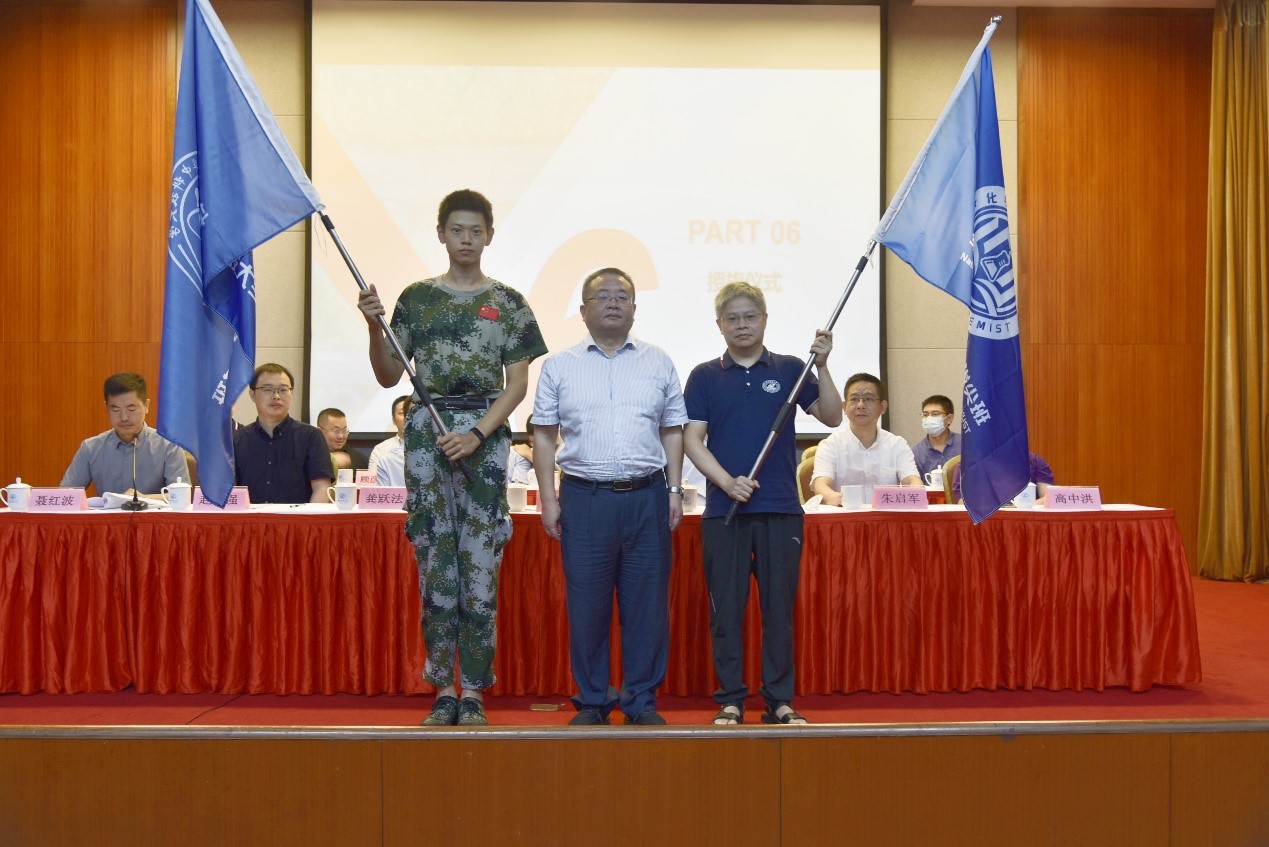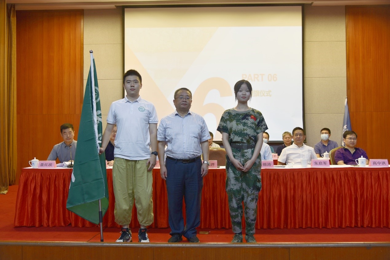 学院党委书记江洪洋为强基班、化学拔尖班、本硕博共建“美丽化学”授旗。