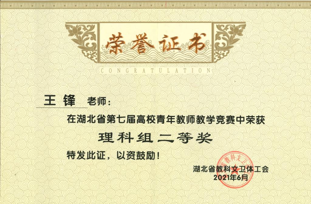 (通讯员:吴映辉)由湖北省教科文卫体工会主办的湖北省第七届高校青年教师教学竞赛于2021年5月13日-16日在武汉举办,我院青年教师王锋代表学校参赛并荣获理科组二等奖。