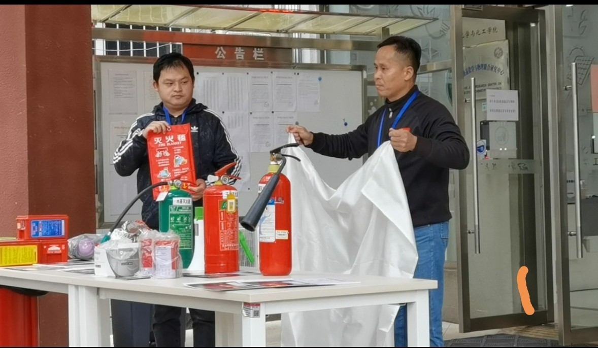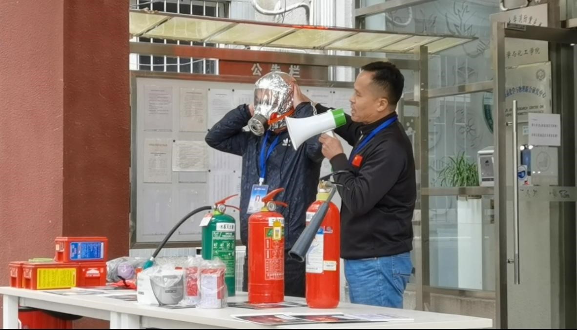 下午2:30的消防安全知识讲座由保卫处的舒老师主讲,他从实验楼发生火灾的应急处置,讲到灭火器的使用和其他安全应急措施,再从实验室的个人防护讲到消防急救用品的使用,向我院师生进行了生动详细的说明和分析。接着向大家示范了各类灭火器、防烟面具、灭火毯等防火灭火器具的使用方法,尤其强调了如何正确地佩戴防烟面具。通过讲座大家初步掌握了火灾险情出现时的灭火和逃生技能。