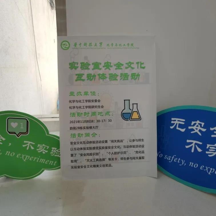 为提高学院师生实验安全责任意识,营造浓厚的实验室安全文化氛围。2021年11月8日,化学与化工学院安全管理委员会、研究生会在韵苑28栋一楼大厅开展了实验室安全文化互动体验活动。活动主题是“无安全,不实验”,我院200余名师生参与其中,收益良多。