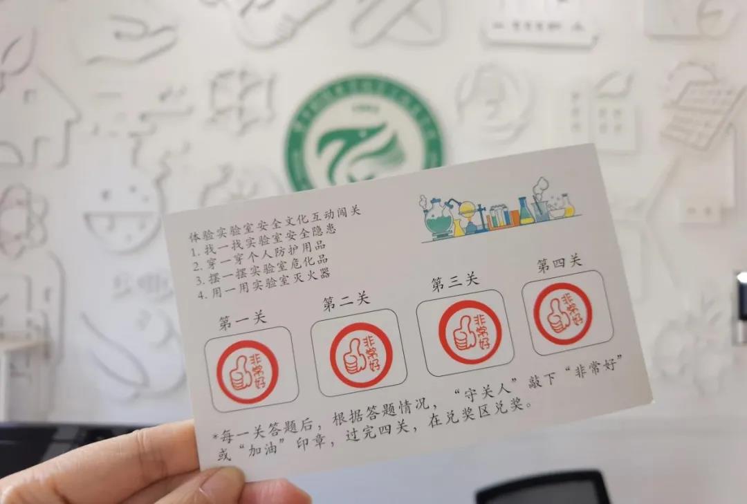 此次互动体验活动设置了“安全风险识别”,“个人防护示范”,“危化品取用”,“灭火工具选择”等四个关卡:1.找一找实验室安全隐患;2.穿一穿个人防护用品;3.摆一摆实验室危化品;4.用一用实验室灭火器。闯关者们顺利通过关卡可获得“非常好”贴纸奖励,集齐四枚贴纸可兑换实验室安全文化精美文创。