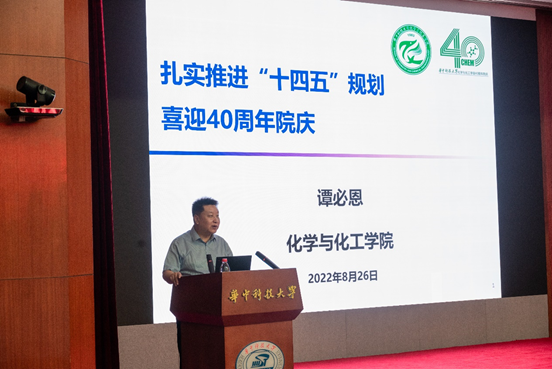 谭必恩院长以《扎实推进“十四五”规划,喜迎四十周年院庆》为主题,从上学期学院工作回顾和本学期学院重点工作两个方面进行了报告。谭院长首先对学院上半年工作取得的进展表示了肯定,尤其在教学成果、学科竞赛、基础设施改造、社会实践等方面都有所突破,并重点介绍了学院院庆的相关准备工作和已取得的一系列成绩。谭院长也指出我院仍存在战略人才、国家平台与标志成果均偏少的问题。今后,学院需要聚焦化学学科发展方向,将学院发展与学校规划有机结合,争取在教学成果奖、全国大赛上取得突破。最后,谭院长希望全院教职工都可以顶天立地创一流,追求卓越谋新篇,为学院发展贡献出自己的力量。