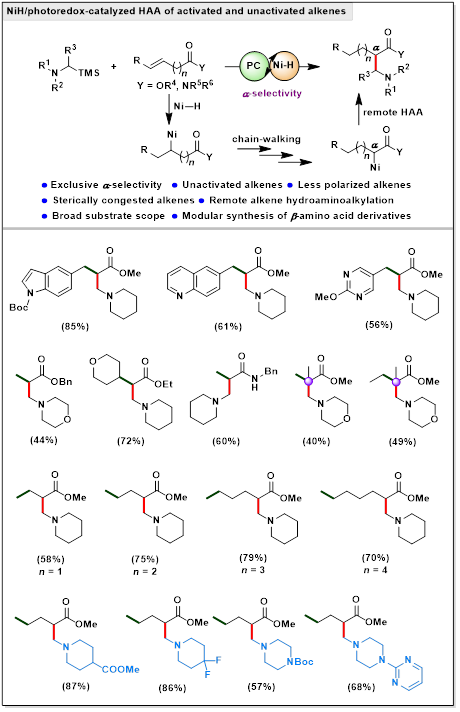 华中科技大学袁伟明课题组一直致力于可见光/镍协同催化自由基偶联反应研究(Angew. Chem. Int. Ed. 2020, 59, 17910; Angew. Chem. Int. Ed. 2022, 61, e202114731),近日,该课题组又报道了通过可见光/镍氢协同催化策略实现了烯烃的氢氨烷基化反应,获得了优异的α-选择性(图一),该方法与传统Giese加成反应只能获得β-选择性形成优势互补。并且借助NiH“链行走”机制还可以实现远端非活化烯烃的迁移氢氨烷基化。该反应对于烯烃和胺都具有广谱的底物普适性,一系列活化、非活化的末端烯烃和多取代大位阻内烯烃都能反应,且官能团兼容性很好,为结构新颖的非天然β-氨基酸骨架构建提供了高效合成方法。该成果于近期发表于《美国化学会志》(J. Am. Chem. Soc. 2022, doi.org/10.1021/jacs.2c08039)。
