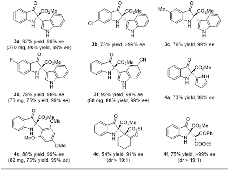 该研究建立的酶催化不对称交叉偶联具有较好的底物兼容性(图2)。苯环上含有不同电子和立体性质取代基的吲哚酚能顺利发生预期反应,收率为73-78%,立体选择性一般都为99%ee。此外,不同位置取代的吲哚亲核试剂、富电子类吡咯、1,3,5-三甲氧基苯和1,3-二甲氧基苯也同样适用。亲核试剂的范围还可以进一步扩展到sp3杂化的碳亲核试剂,如环状和非环状β-酮酸酯,相应的产物均具有极好的立体选择性。部分底物的放大实验(0.3-1.0 mmol)发现,产物的产率和光学纯度不受影响。