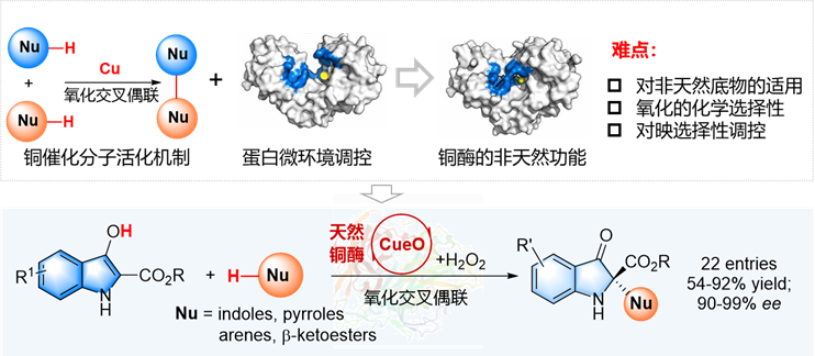 2月15日,国际期刊《德国应用化学》(Angewandte Chemie International Edition)在线刊发了化学与化工学院钟芳锐教授团队完成的最新研究成果“拓展铜酶杂泛性催化吲哚氧化交叉偶联反应”(Expanding Promiscuity of a Copper-Dependent Oxidase for the Enantioselective Cross-Coupling of Indoles, DOI: 10.1002/anie.202219034)。该论文报道了首例铜外排氧化酶(CueO)催化吲哚类底物的氧化交叉偶联反应,合成了一系列光学纯2,2-二取代吲哚啉-3-酮类化合物。该反应具有条件温和、催化剂经济、选择性高、底物普适性好等优点,所制备的光学纯吲哚3-酮衍生物ee值高达99%,并基于这些产物的生物活性筛选得到了两个具有显著抗肿瘤活性分子。