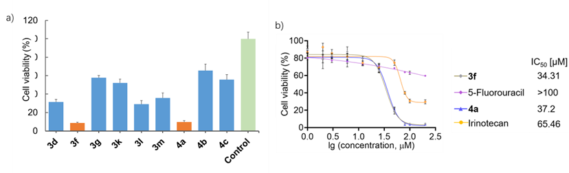 相关文献表明,2,2-二取代吲哚啉-3-酮类分子可能具有显著的生物活性。作者利用MTT法测定了部分产物对MCF-7肿瘤细胞系的毒性,得到了两个显著抗肿瘤活性的化合物3f和4a(浓度为50μM)。随后的详细实验拟合得到了两者的IC50值分别为34.31 μM和37.2 μM,均高于临床药物伊立替康和5-氟尿嘧啶(图4),具有潜在的药物应用价值。