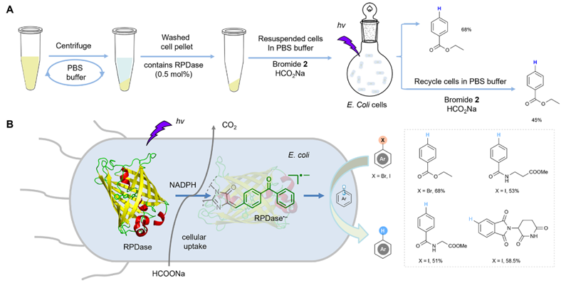 基于RPDase光催化的生物正交性和基因密码扩展技术,团队进一步使用表达RPDase的重组大肠杆菌细胞进行全细胞光生物催化。RPDase在活细胞条件中能同时利用内源的NADPH和外源的甲酸钠实现芳香卤化物的脱卤氢化。该研究结果表明,含有非天然光催化剂的人工光生物催化有望成为廉价易得的化学原料高值化转化的细胞工厂(图4)。