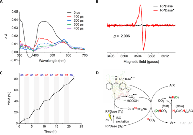 团队对该人工光生物催化体系的酶催化机制进行了深入探究(图3)。通过TEMPO自由基捕获、瞬态吸收光谱和电子顺磁共振等实验证明了芳基自由基的生成。同位素实验表明,甲酸钠是非常高效的终端还原剂和氢供体,氢化效率显著高于天然还原剂抗坏血酸钠。此外,开关灯控制实验发现,黑暗条件下反应会继续进行,表明反应过程中存在一定的链传递过程。基于上述实验结果,团队提出了可能的光生物催化机制。在RPDase空腔微环境中,光照和甲酸钠促使了强还原性二苯甲酮自由基阴离子和二氧化碳阴离子自由基的生成,两者均可促进芳基卤化物的单电子还原生成芳基自由基,并进一步捕获甲酸钠的氢原子或氘原子生成还原产物。