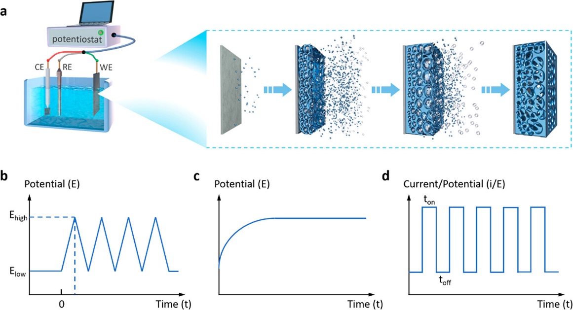 气泡析出是电镀工业过程中需要避免的一个问题,但在电沉积过程中,同步产生的气泡能够作为致孔剂,用于制备高性能多孔催化剂。在电沉积过程中,原位产生的气泡会逐渐成核、生长,脱离电极表面,在向外的扩散过程中,气泡之间会因为团聚现象逐渐长大。在这一过程中,沉积物以产生的气泡作为模板,形成最终的多孔结构,并且孔径大小从电极表面向外逐渐增大。这种分级的多孔结构有利于电催化反应的物质传输和气体扩散。根据气泡产生方式的不同,该类方法可分为动电位沉积、恒电流沉积和电冲击三种。