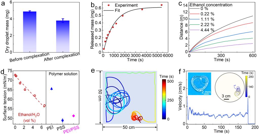PEI/PSS液滴在固化的同时向水溶液中缓慢释放微量的PSS 和PEI分子,其中PSS可以降低水的表面张力,从而产生表面张力梯度。将PEI/PSS液滴置于pH为1.25的水中1.5小时后,液滴的总质量损失为22.1 wt%(图2a),其中,PSS的释放率随时间降低,最终趋于平稳(图2b)。此外,随着酸性水中乙醇浓度的增加,液滴的平均速度和总移动距离都会减小(图2c)。这是因为乙醇的加入降低了酸性水的表面张力(图2d)。进一步,作者探讨了边界对液滴运动的影响。在方形容器中的结果(图2e)与圆形容器(R=10 cm)类似(图1b),液滴首先向方形容器的边界移动,并在沿着边界的路径中获得手性运动轨迹。这些观察结果表明,液滴马达的手性自推进不需要受限边界。然而,在强一维约束下(~ 7倍液滴直径),液滴将沿着通道进行定向运动,而不发生手性运动。