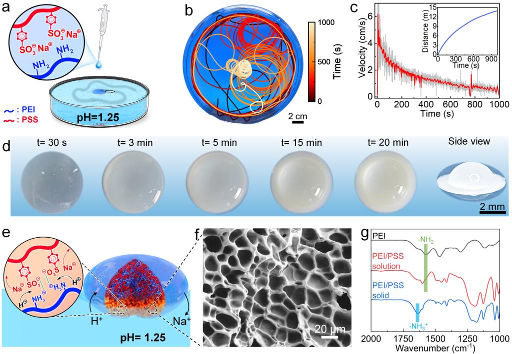 聚乙烯亚胺(PEI)和聚苯乙烯磺酸钠(PSS)水溶液(25 wt%)的pH值为13左右,此时,胺基的质子化和PEI/PSS的络合作用很弱,PEI/PSS可以形成均匀溶液。而将PEI/PSS溶液(20 μL)滴在酸性水溶液(pH=1.25,图1a)上时,令人惊讶的是,PEI/PSS液滴并没有溶解,而是自发地在水-空气界面移动(图1b)。在自主推进过程中,PEI/PSS游泳者逐渐由透明变为不透明,形成类似UFO的形状(图1d)。这种相转变过程是PEI/PSS络合导致的。由于周围的水溶液呈酸性,质子通过液滴界面扩散到液滴内,触发PEI/PSS络合(图1e),并形成了一个薄的固体边界(图1f),最终会导致完全固化。FTIR证实了络合物中质子化氨基的存在。