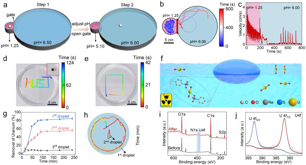 基于磺酸-铀酰配位,液滴微马达可以作为先进的“清洁机器人”,从水中去除放射性铀元素(图6f)。液滴首先在pH=1.25的酸性水溶液中分别络合3分钟、10分钟和6小时,然后转移到10 ppm的铀溶液中。第一个液滴(络合3分钟)去除动力学最快,在90分钟内去除了84.7%的铀,而第二个液滴(络合10分钟)和第三个液滴(络合6小时)在相同的时间内去除了54.1%和8.7%的铀(图6g)。在运动的前20分钟内,第1液滴的速度比第2液滴更快,探索的面积也更大,而第3液滴是静止的。因此,自推进运动有助于促进液滴微马达探索铀酰离子没有被吸附的区域。此外,液滴产生的流场通过打破铀酰离子的被动扩散来促进溶液的混合。因此,通过液滴游泳器的主动运动,大大提高了除铀效率。