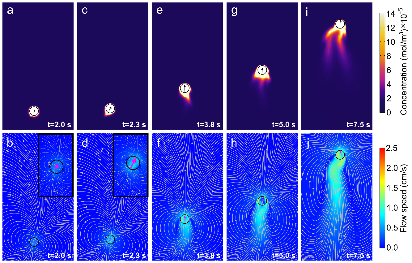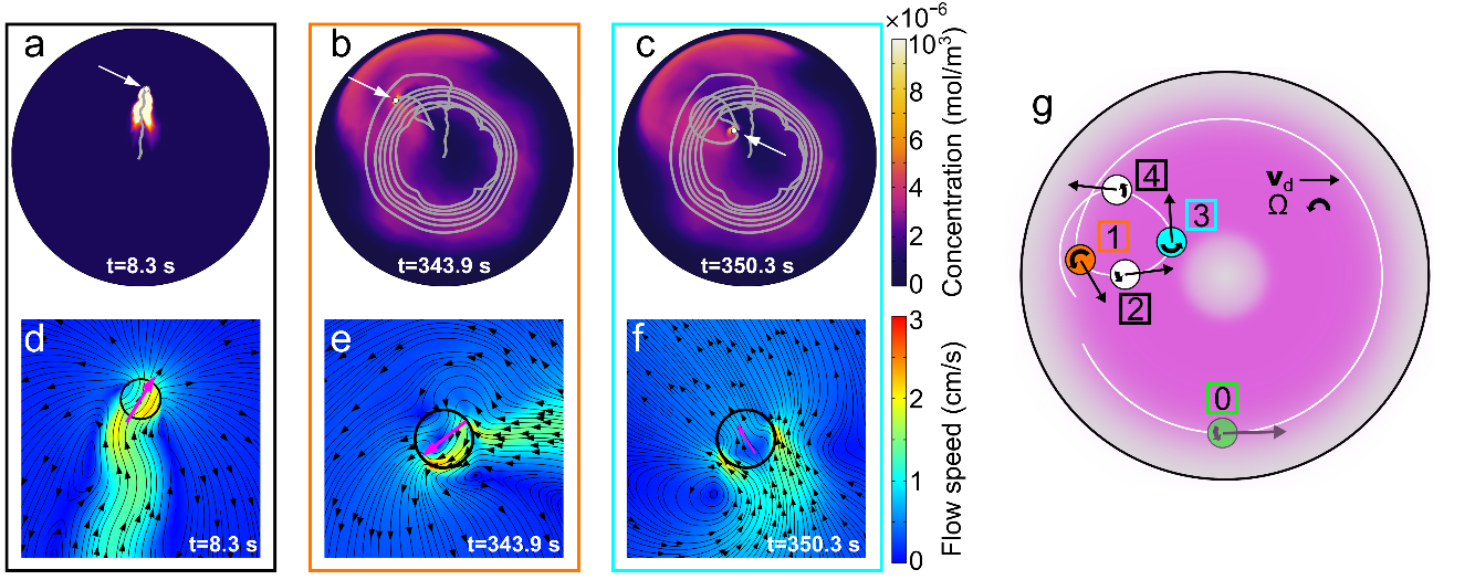 通过2D模型,作者模拟了液滴释放PSS并建立表面张力梯度的过程。最开始,由于液滴和周围流场的对称性,液滴并不能运动。然而,在高Pe数下,对称性的微小自发破坏导致PSS分布和液滴动力学的正反馈循环,即PSS分布的自发扰动导致马兰格尼流场的微小不对称,从而在液滴上施加一个弱的有效作用力。该力的方向指向低PSS浓度区。随着液滴向远离高PSS区的方向运动,PSS分布以及马兰格尼流场的不对称性进一步加剧,进而导致有效作用力的增加。这种正反馈循环使液滴的运动速度增加,直到达到一个饱和值。