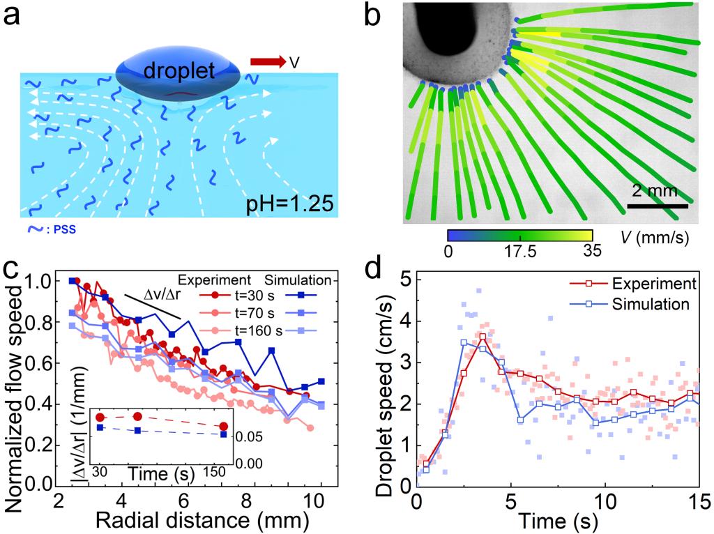 液滴的自固化过程伴随着PSS不断向周围水溶液释放(图3a),降低了液滴附近的表面张力,这反过来又在空气-水界面诱导了长程马兰戈尼流动(图3a,b)。由于液体的不可压缩性,液滴产生的整体流场是三维的(图3a)。当用针将液滴固定在空气-水界面上使其充当“泵”时,液滴在空气-水界面处的液体流速随着径向距离的增加呈线性衰减。这与基于二维模型的模拟结果一致(图3c,d)。