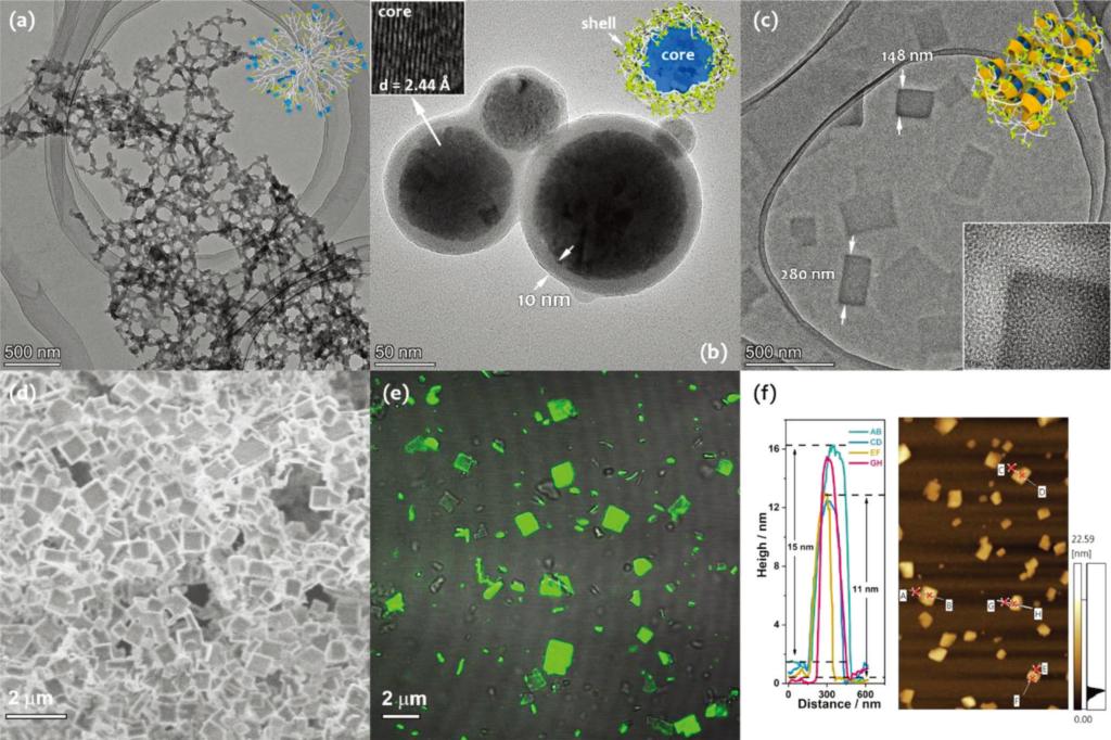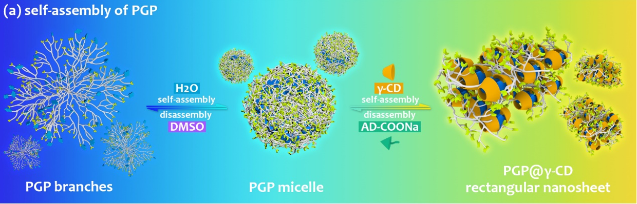 PGP是一种末端含有芘分子单元和胺基的树枝状聚合物(图1),PGP聚合物中预设了四种具有刺激响应的分子结构特征:双亲性、芘单体/二聚体响应性、主客体组装性及可逆螯合位点——这些分子结构特征使得PGP显示出丰富的“智能”特性。在水溶液中,PGP的双亲性促使其自组装成为球状核壳胶束,球状胶束的结构特征进一步促成了芘单元的激基缔合物(excimer)特征发光(青绿色荧光);在有机溶剂中,PGP又可以解组装为无规则树枝状,这种形状有利于芘以单体形式发光(蓝色荧光);通过芘与γ-环糊精的主客体作用,PGP在水中进一步与环糊精组成标准的长方形纳米片,实现芘激基缔合物发光的进一步红移,从而发出特征的黄色荧光。通过在标准纳米片体系中引入金刚烷客体分子,PGP与环糊精形成纳米片快速解组装,PGP重新形成球状胶束,荧光颜色也由黄色恢复为青绿色。通过外部刺激,PGP展现出丰富的组装行为,并表现出特有的形致荧光变色效应。