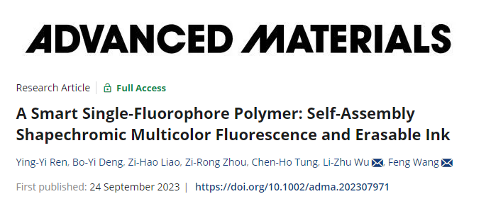 近日,华中科技大学化学与化工学院王锋教授课题组设计开发了一种兼具智能形致变色能力(变形)和荧光开关效应(隐身)的单发色团荧光聚合物PGP。在不同的外部刺激下,通过内嵌于PGP中的“分子机关”可触发PGP形成三种典型形貌,且展现出形貌依赖的特征荧光色彩:即青绿色荧光的球形核壳胶束、黄色荧光的标准矩形纳米片和深蓝色荧光的无定形枝状物。此外,PGP还可以作为一种水性荧光墨水,可实现在纸上的多次擦除/显影。该研究成果以“A Smart Single-Fluorophore Polymer: Self-Assembly Shapechromic Multicolor Fluorescence and Erasable Ink”为题,于近期发表在国际著名材料期刊《Advanced Materials》上,论文第一作者为华中科技大学化学与化工学院硕士研究生任颖异,华中科技大学王锋教授和中国科学院理化技术研究所吴骊珠院士为共同通讯作者,华中科技大学化学与化工学院为第一完成单位。